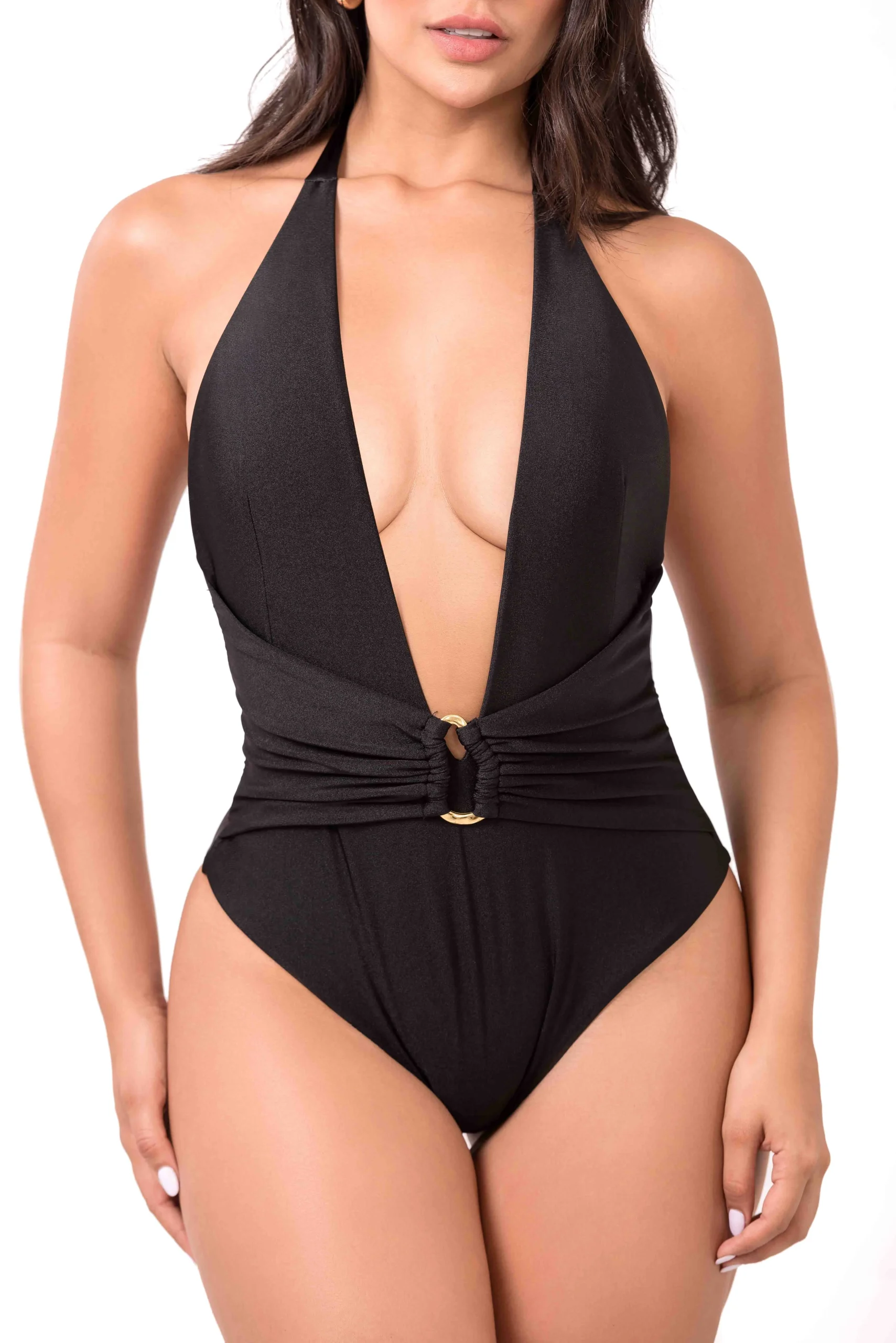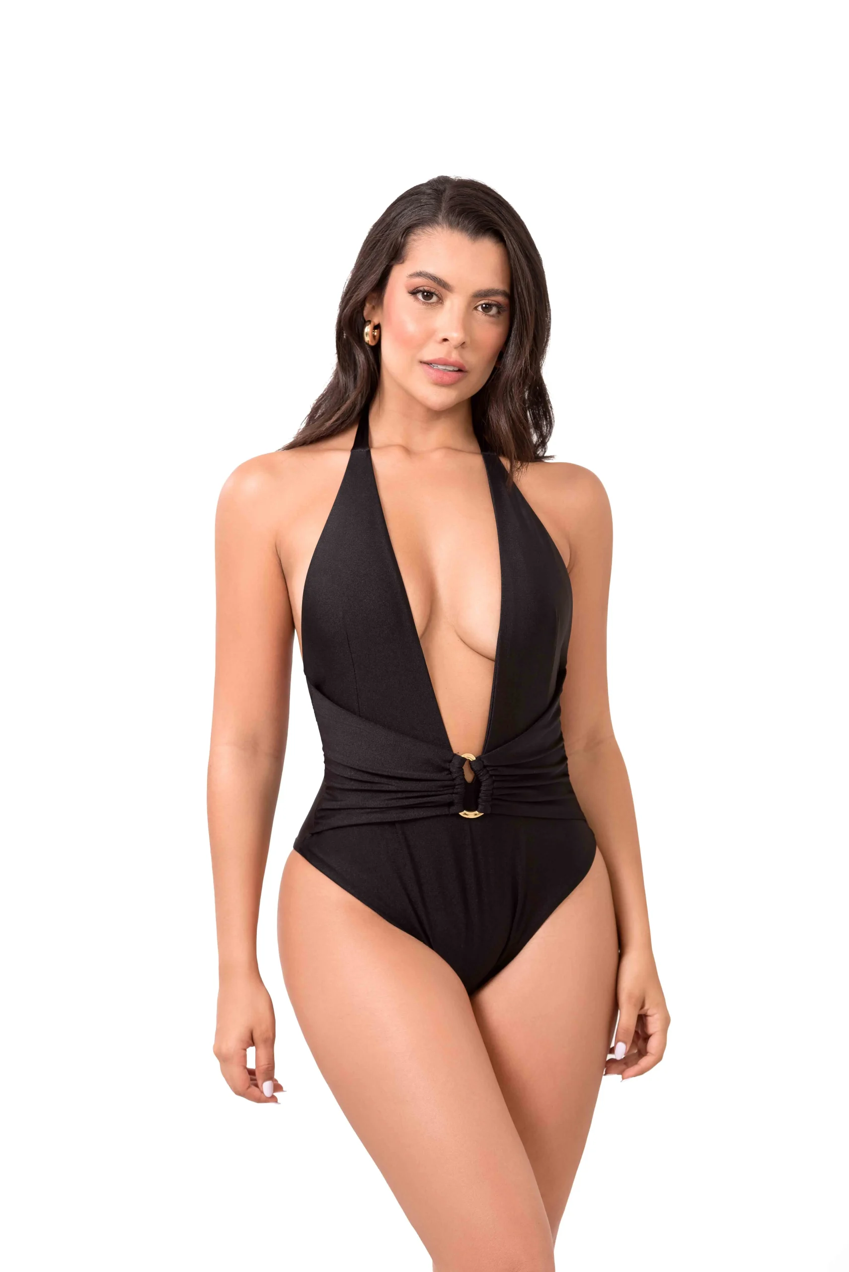 Traje de baño completo, copa tipo halter, cinturón con accesorios dorados, tela brillante